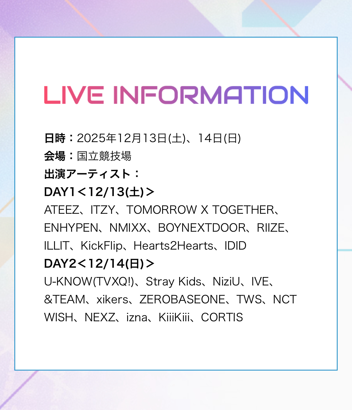 KBSの音楽番組「ミュージックバンク」の年末スぺシャルイベント「2025 MUSIC BANK GLOBAL FESTIVAL IN JAPAN」が2025年12月13日(土)、14日(日)に日本で開催されます!👏
