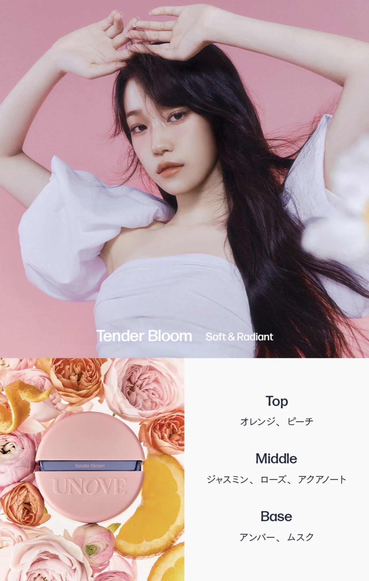 UNOVEのヘアケア製品のフローラルノートと調和するように開発されており、UNOVEの製品と併用する場合でも必ず同じ香りで揃えなくてもよく、香りをレイヤリングして自分の香りを完成させることもできるそうです😊